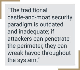 Zero-trust architecture: The traditional castle-and-moat security paradigm is outdated and inadequate; if attackers can penetrate the perimeter, they can wreak havoc throughout the system.