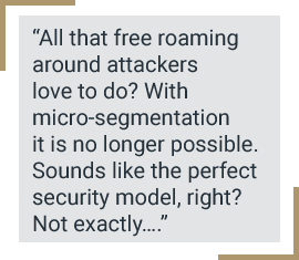 Micro-segmentation implements further restrictions whereby the network is split into smaller, more granular sections, preventing lateral network movement. All that free roaming around attackers love to do? With micro-segmentation, it is no longer possible. Sounds like the perfect security model, right? Not exactly…