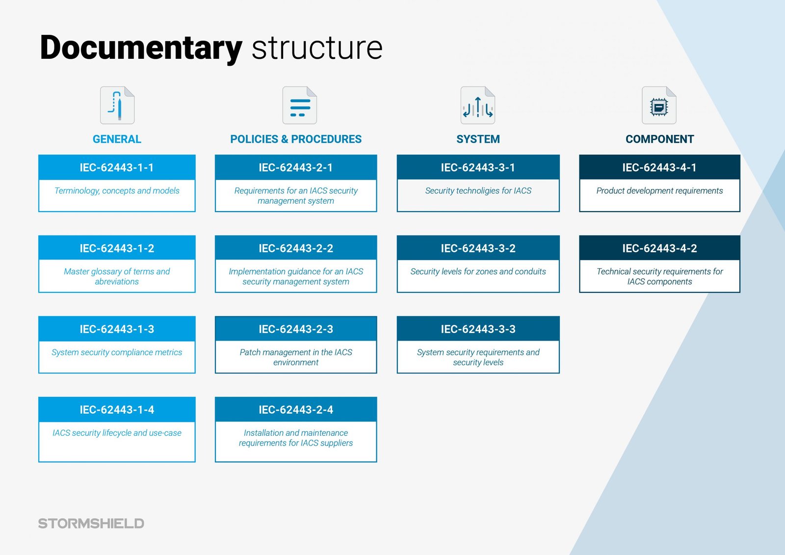 The IEC 62443 standard consists of several documents – for informed audiences – grouped into four sections.