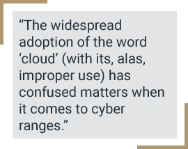 The widespread adoption of the word ‘cloud’ (with its alas improper use) has confused matters when it comes to cyber ranges. A cloud cyber range is a cyber range available through the cloud, normally a public one. A cloud-based cyber range is instead a cyber range built on cloud technology, which does not necessarily mean that the range is available through the cloud, although that is also likely. The key here is to focus on the underlying technology used for the development of the range.